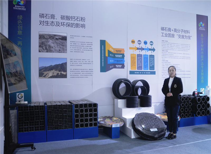 近年来,在国家环保政策引导下,贵州磷石膏产业发展如雨后春笋,涌现出了磷石膏在高分子材料中应用的新材料。贵诚集团认真贯彻落实贵州省委省政府“以渣定产”加快磷石膏多领域应用的重大决策部署,推进磷石膏改性后在高分子材料中的应用,让磷石膏真正变废为宝。自2018年以来,贵诚集团将磷石膏在高分子材料中的应用项目,纳入集团5年发展战略规划,投入大量研发经费,组建产、学、研科研团队,历时两年成功研制出了GFZ-磷石膏双层钢塑管、GFZ-W磷石膏双壁塑金管、GFZ-磷石膏塑合金电力通信管、GFZ-磷石膏碳纤维五防井盖、GFZ-磷石膏树脂井盖等三大类200多个型号的新产品,成功实现高分子磷石膏产品的工业化生产,产品各项性能指标超市场同类产品。并在贵州省内各地排水排污、雨污分流、黑臭水体治理、市政道路改造等重点项目中使用,获得建设单位一致好评。 在绿博会期间,贵诚集团现场展示的多个磷石膏产品,吸引了众多嘉宾的驻足参观,并不时用手机进行拍照和现场录像。